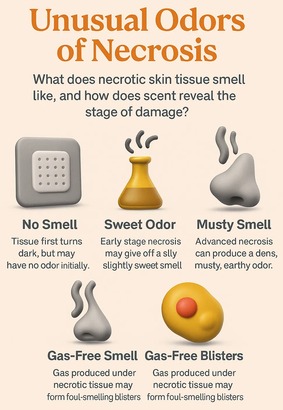 Necrotic skin tissue has a distinct and often unforgettable smell. In its early stages, the odor may be mild—slightly sour or sweet—caused by initial bacterial activity as tissue begins to break down. As necrosis progresses, the scent becomes stronger, turning foul, putrid, and sometimes described as “rotting flesh.”